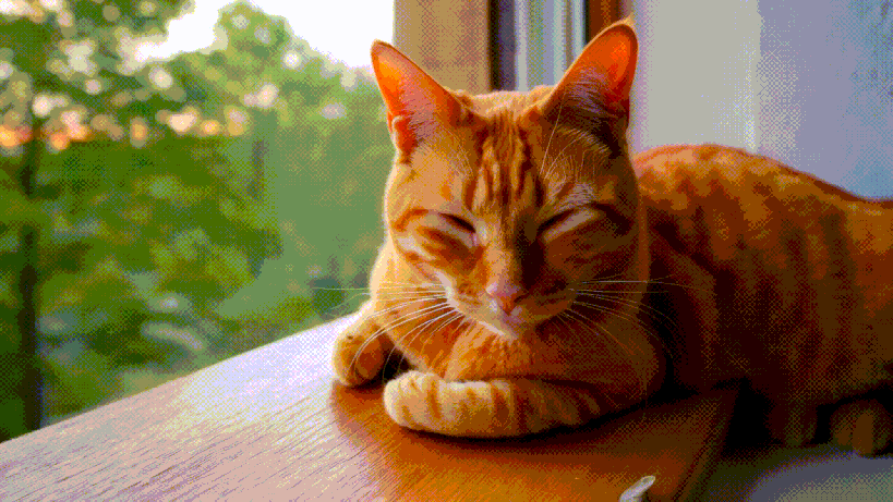 A ginger cat curls up on the windowsill, with sunlight streaming through the window and casting a warm glow on its soft fur. The cat peacefully closes its eyes, while the green trees outside sway gently in the breeze. The air is filled with the calmness of the afternoon.