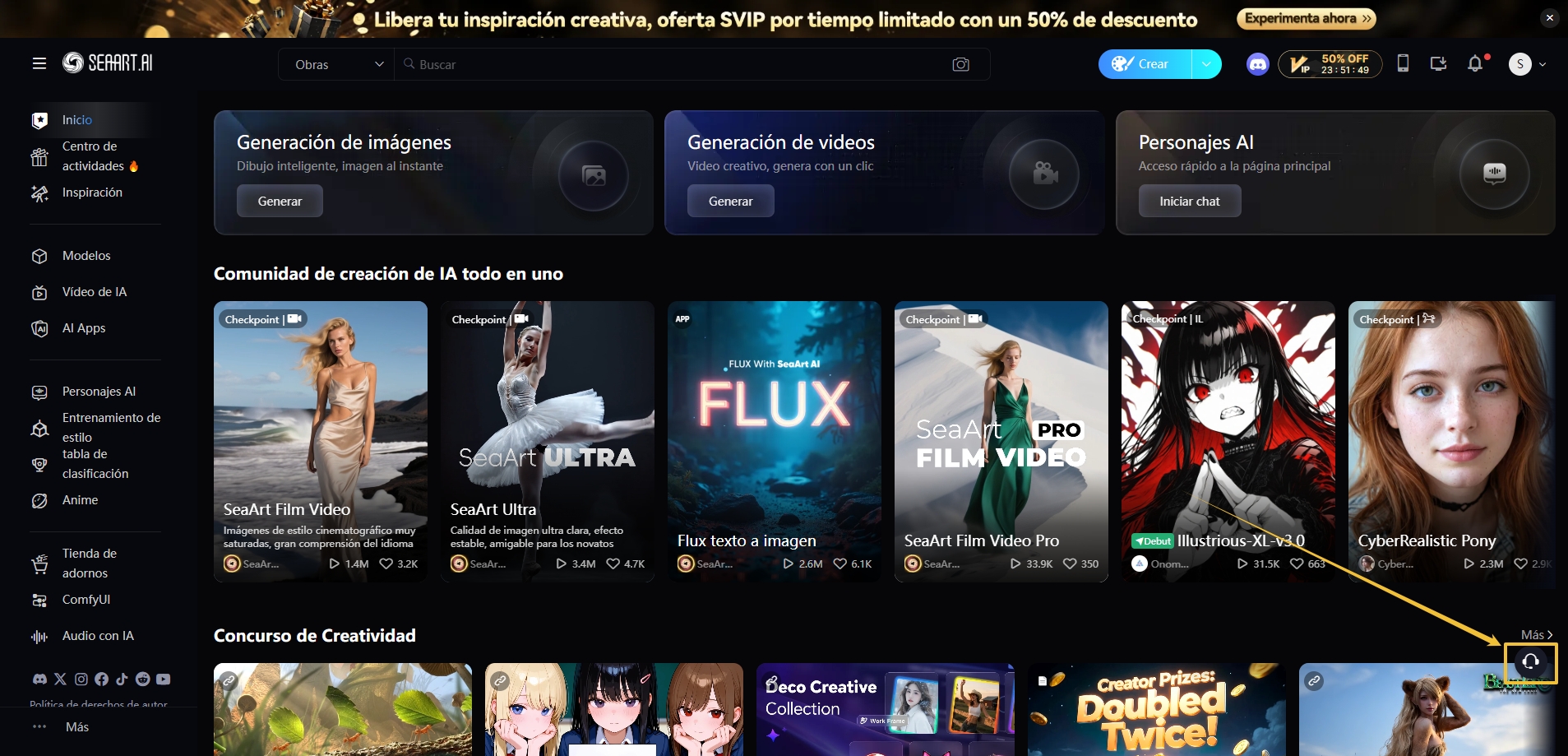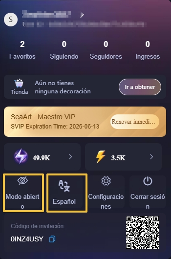 Entrada a la página: Haz clic en el icono VIP en la esquina superior derecha para entrar en el centro comercial SeaArt.
