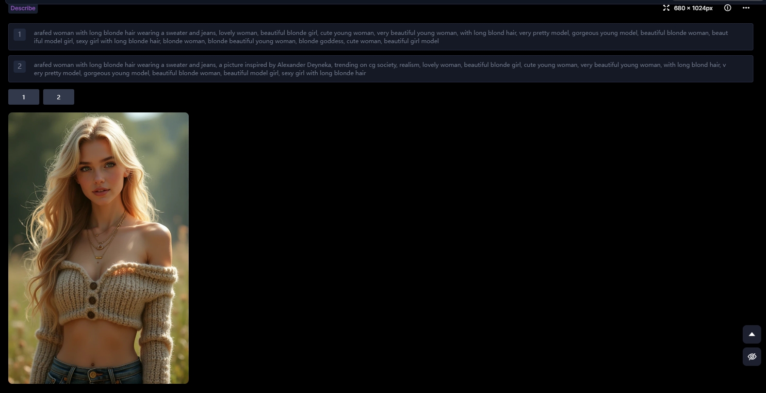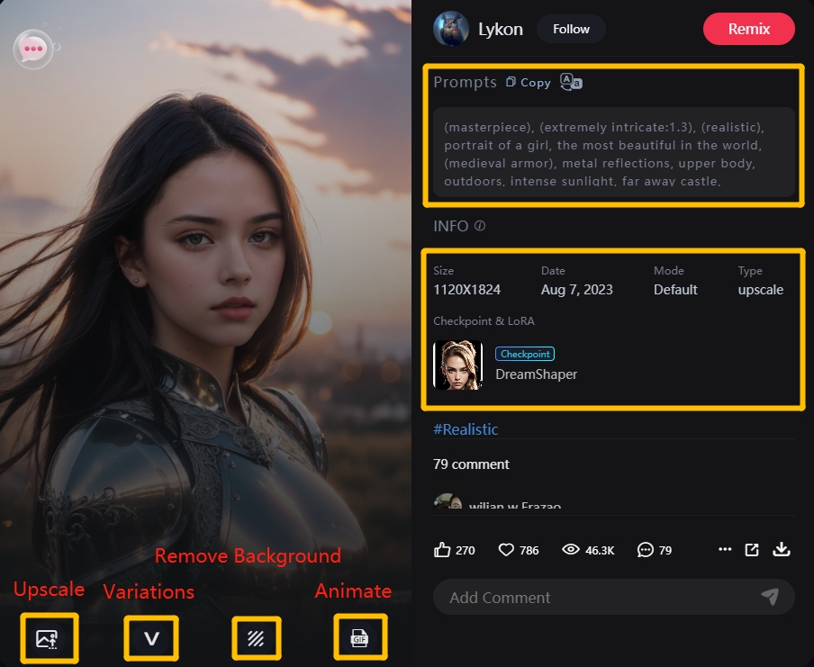 En la página de detalles de la obra, puedes ver los mensajes utilizados para crear la imagen, el modelo, otra información detallada y los comentarios de los usuarios.