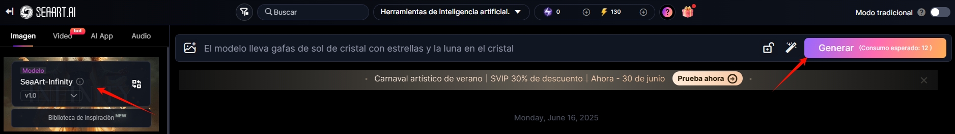 Entrada a la página: Haz clic en "Generar" en la esquina superior derecha para acceder a las funciones de generación de imágenes, personaje de IA, audio, canvas y flujo de trabajo.