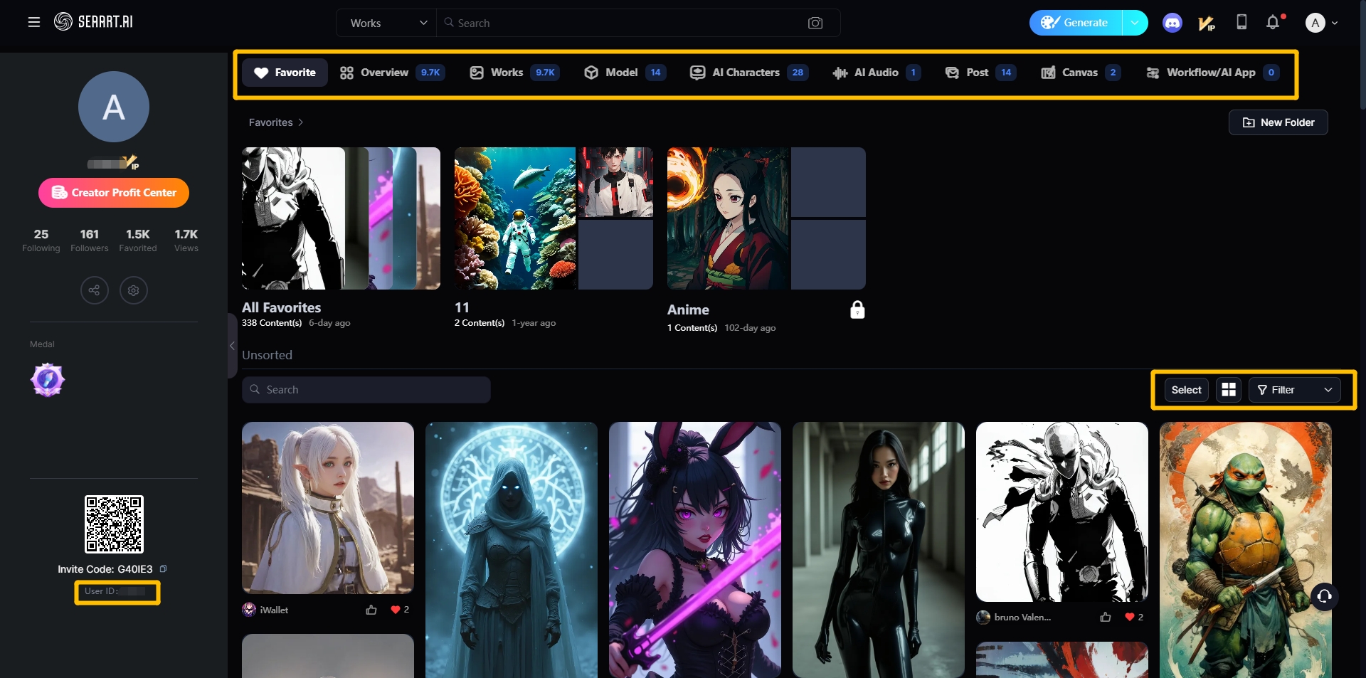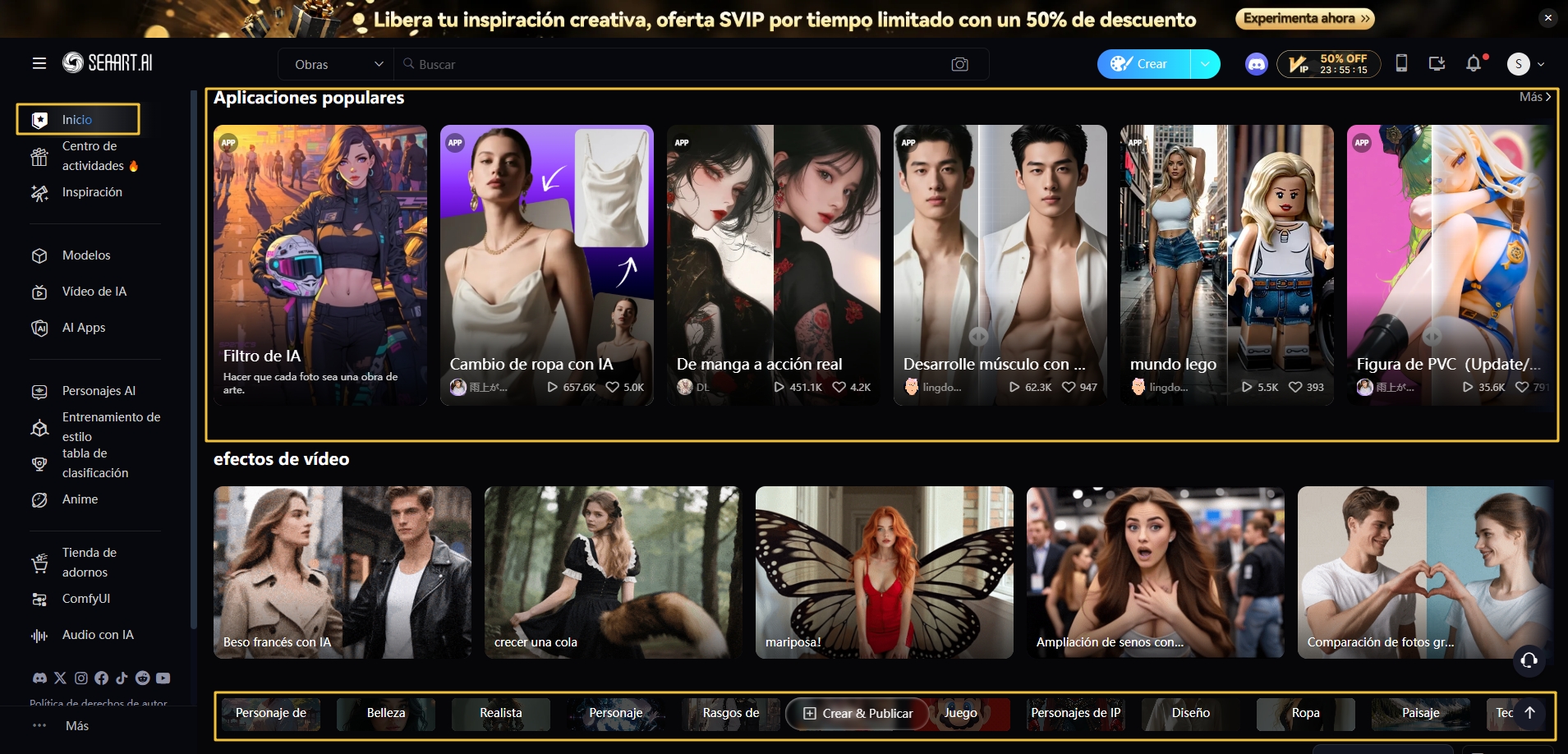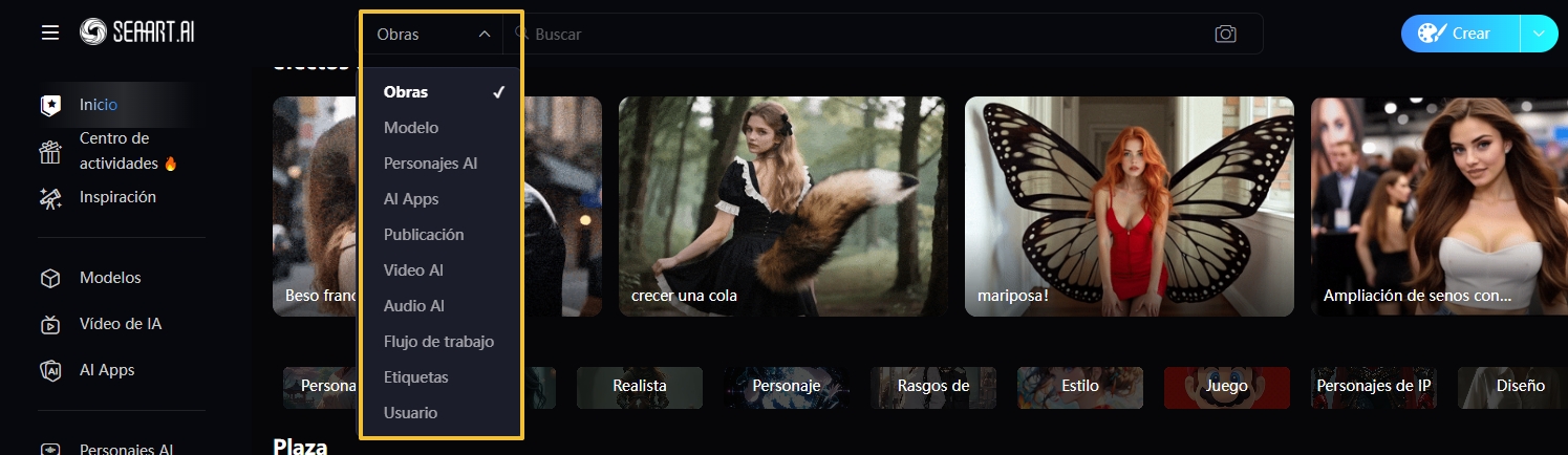 Barra de búsqueda: Elige buscar obras/modelo/personajes de IA/aplicaciones de IA/publicación/video IA/audio IA/flujo de trabajo/etiquetas/usuario.