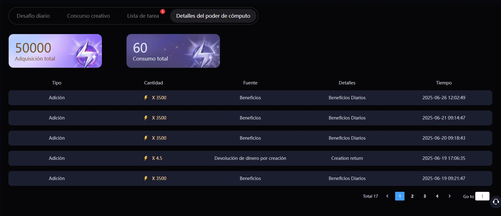 En el registro completo, puedes ver las ganancias totales y el gasto total de potencia de créditos/energías.