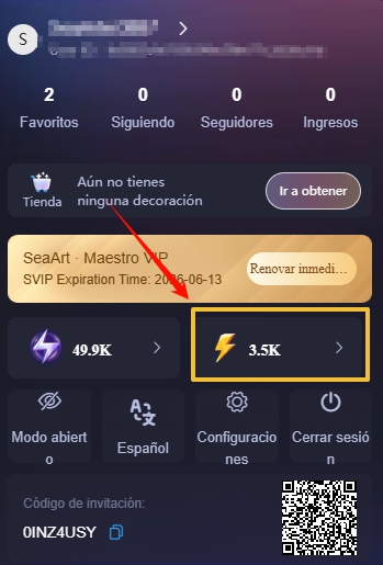 Toca el icono "VIP" en la esquina superior derecha de la página para comprobar el precio y comprar créditos en el centro comercial SeaArt.
