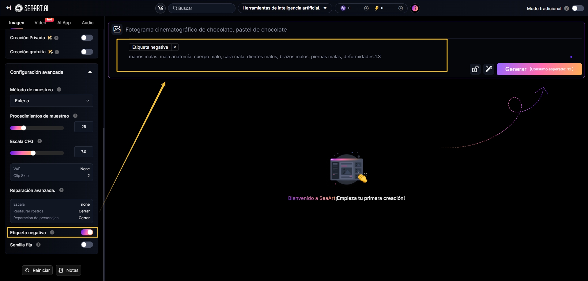 En el campo de prompt negativo, introduce elementos no deseados como: “borroso, baja calidad, marca de agua.” Usa pesos para reforzar las exclusiones, ej: (múltiples personas: 1.5) para controlar retratos individuales.