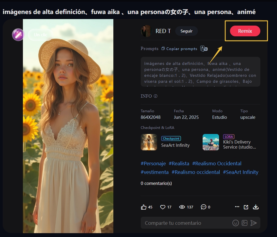 Remix: Si encuentras que redactar prompts es demasiado complejo, puedes buscar inspiración en imágenes generadas por IA en la página principal y reutilizar parámetros y prompts existentes con un clic para simplificar el proceso.