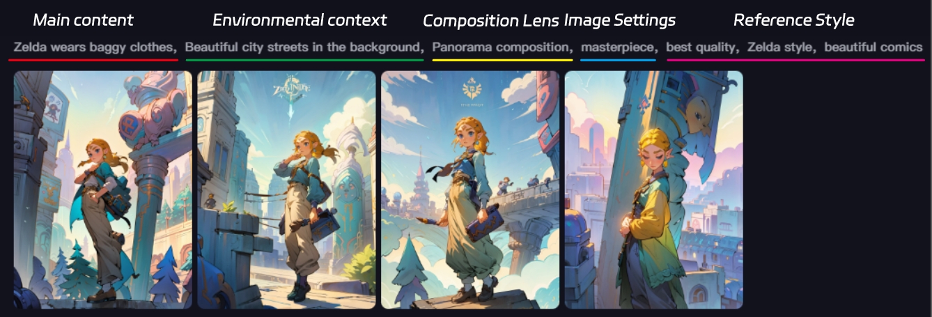 *Los prompts ricos permiten un mejor control del efecto final. En el proceso de ajuste fino posterior, se pueden modificar rápidamente palabras clave específicas y verificar su impacto en el resultado del dibujo.