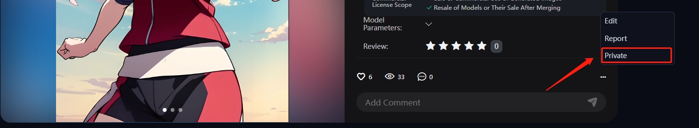 Después de publicar la LoRA, haz clic en la página de detalles de la LoRA, luego en los tres puntos en la esquina inferior derecha y selecciona “Privado”.