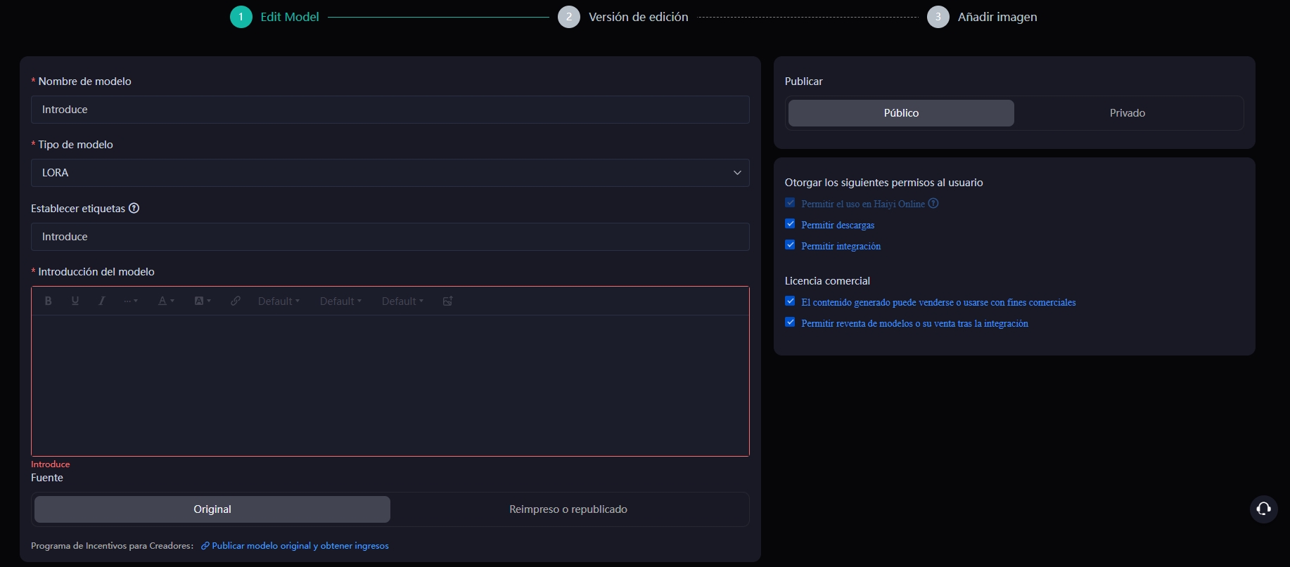 Haz clic en Publicar, edita la información de la LoRA y completa los datos requeridos, incluyendo Nombre de LoRA, Etiquetas (opcional), Portada de LoRA, Uso del modelo y Permisos del modelo.