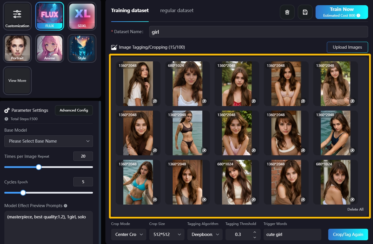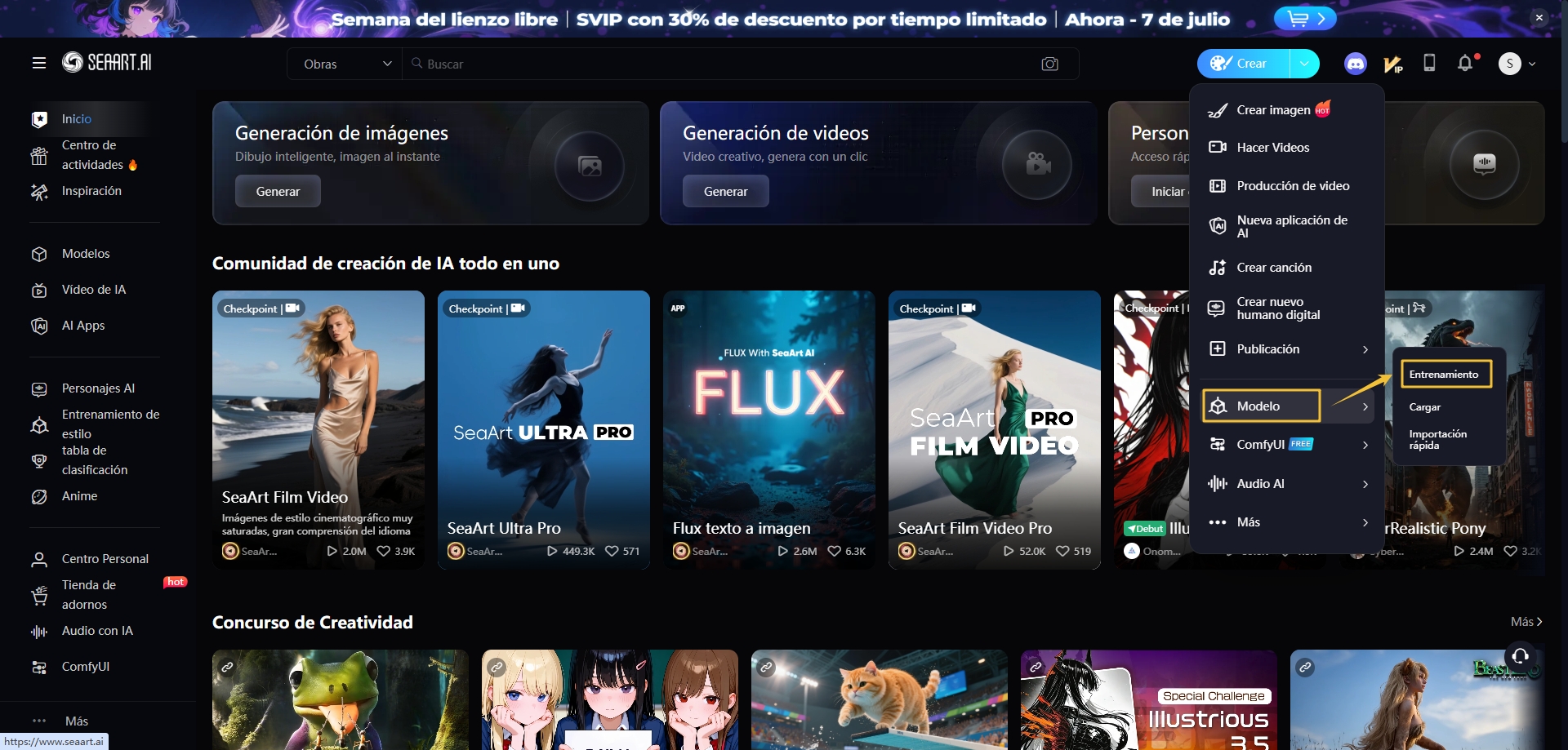 Entrada: Haz clic en el botón “Entrenamiento” en la esquina superior izquierda para ingresar al entrenamiento de LoRA.