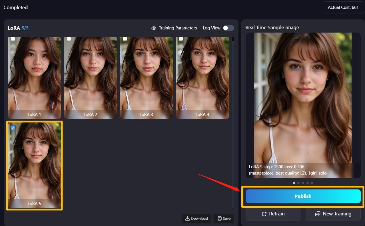 Después de que finalice el entrenamiento, selecciona una LoRA y haz clic en “Publicar”.