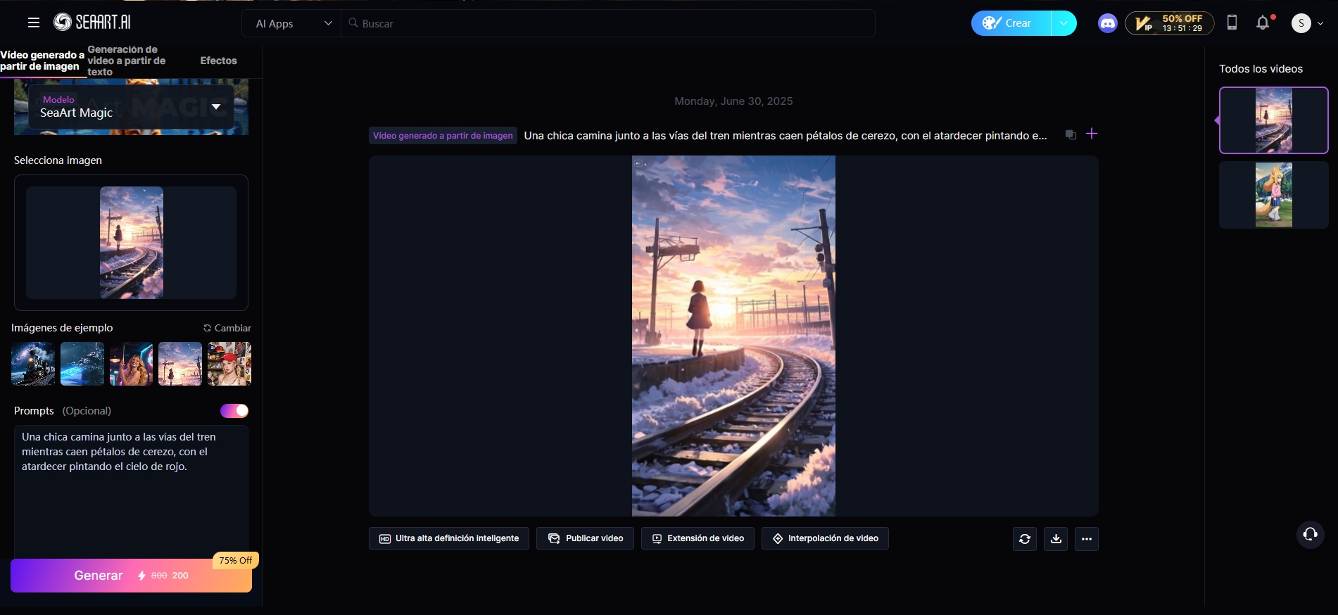Prompts: Opcional. Si no hay prompt, SeaArt generará efectos dinámicos aleatorios basados en el contenido visual. Completar prompts permite un control más preciso sobre la generación del video.