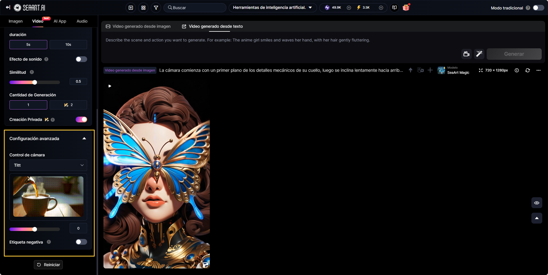 Tanto <mark style="background-color:yellow;">**SeaArt Lite**</mark> como <mark style="background-color:yellow;">**SeaArt Ultra**</mark>, en la función de texto a video, admiten el control del movimiento de cámara, incluyendo los siguientes 10 tipos de movimiento: Horizontal, Vertical, Acercar, Paneo, Inclinación, Rotación, Desplazamiento hacia abajo y alejamiento del zoom, Desplazamiento hacia adelante y acercamiento, Desplazamiento a la derecha/izquierda y acercamiento.