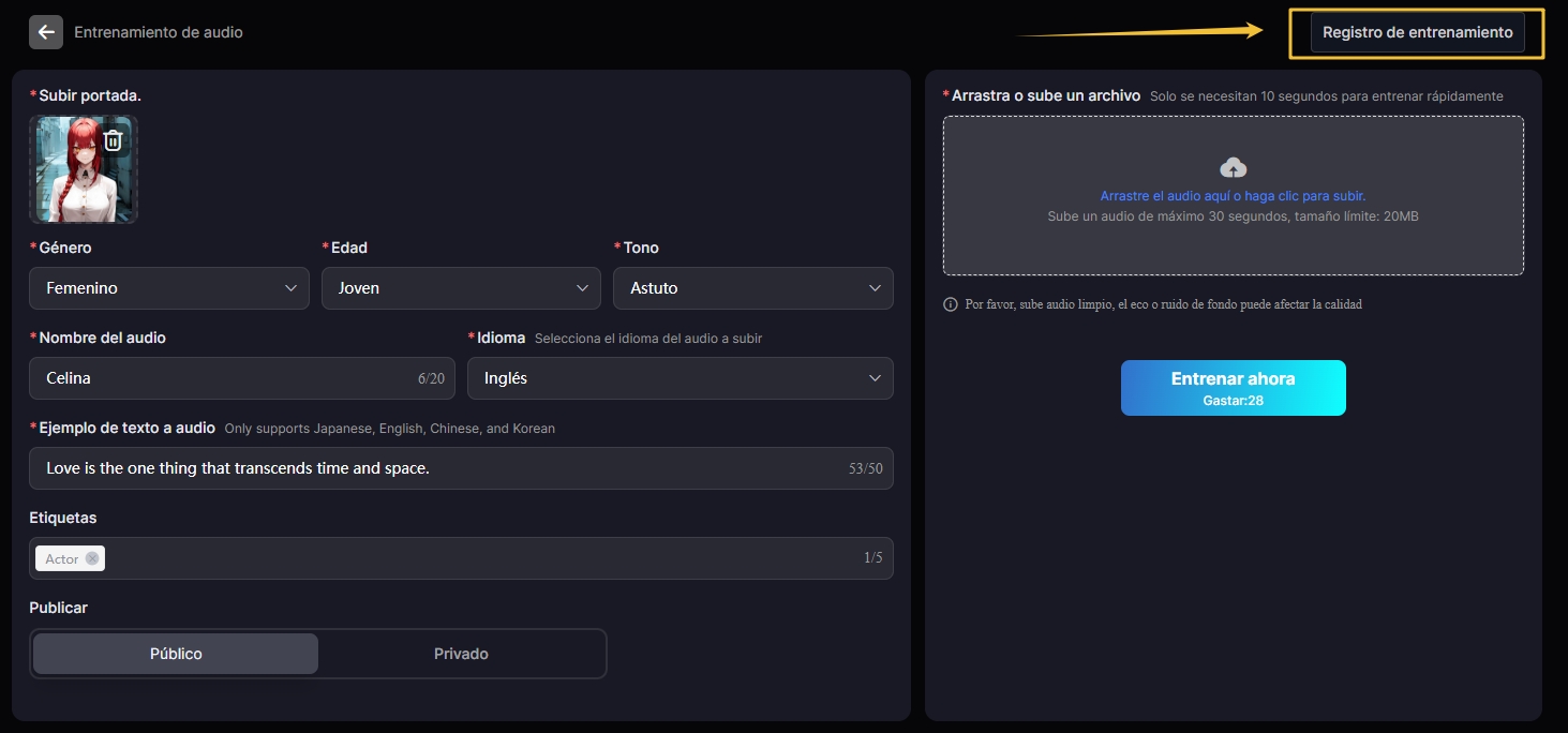 Haz clic en “Registros de entrenamiento” para escuchar el audio entrenado.