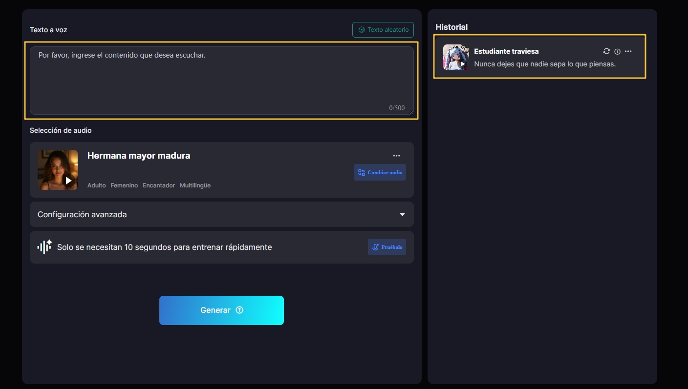 *Puedes consultar tus audios generados anteriormente en el historial que aparece a la derecha.