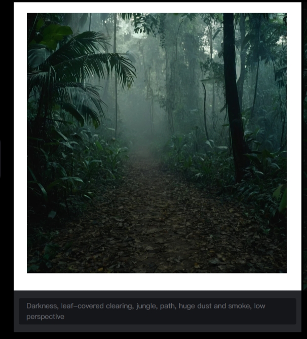 Prompt: Oscuridad, claro cubierto de hojas, jungla, sendero, polvo y humo enormes, perspectiva baja