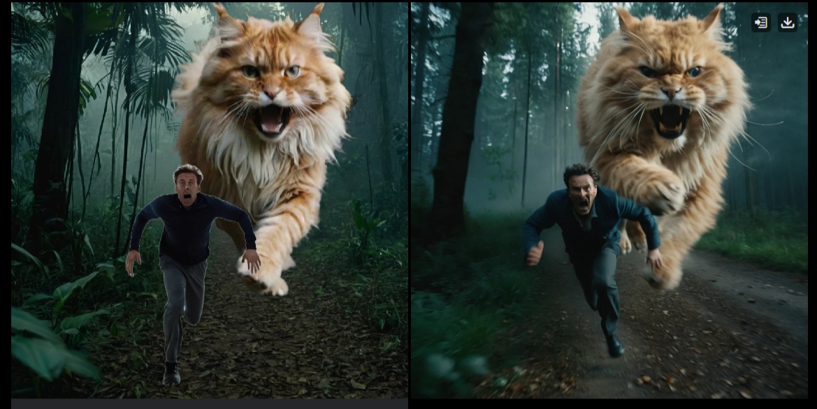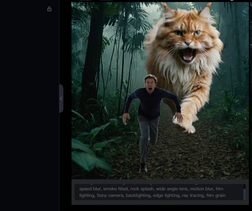 Prompt: Gato gigante y lindo corriendo rápidamente, persiguiendo a un hombre que huye, hombre asustado, desenfoque de movimiento, humo en el aire, salpicaduras de rocas, lente gran angular, iluminación cinematográfica, cámara Sony, contraluz, iluminación de borde, ray tracing, grano de película