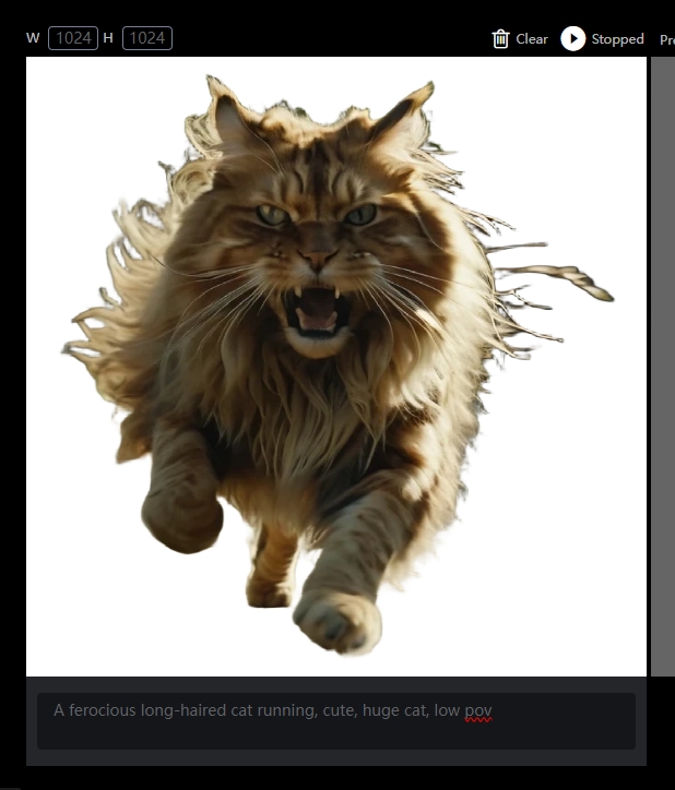 Prompt: Un gato de pelo largo feroz corriendo, lindo, gato gigante, punto de vista bajo (low POV).
