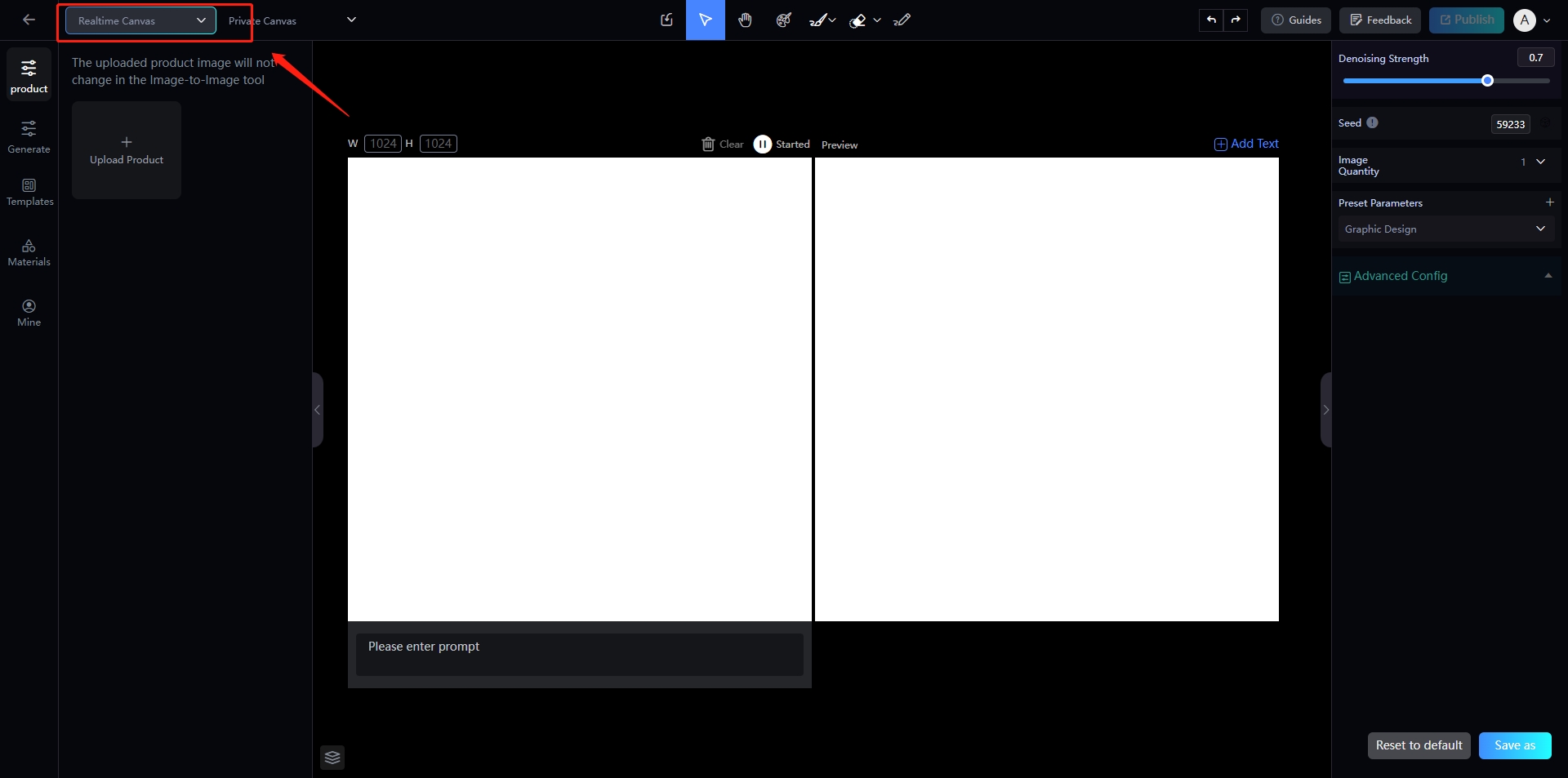 Abre SeaArt Canvas y selecciona Lienzo en tiempo real. SeaArt Canvas ofrece tres modos: Lienzo de generación, Lienzo en tiempo real y Lienzo de diseño.