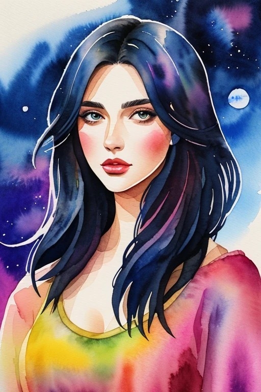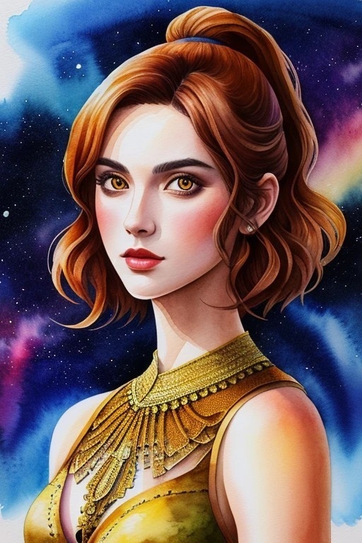 Prompt positivo ilustración de la parte superior del cuerpo, 1chica, (arte digital), tinta acuarela, (calidad ultra:1.3), obra maestra, (muy detallado), HDR, 8K, arte abstracto, (por Charlie Bowater:0.9), (estilo de Maciej Kuciara), ciencia ficción, espacio, medios mixtos