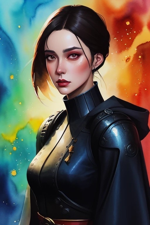 ilustración de la parte superior del cuerpo, retrato, 1chica, pelo negro, corte bob, traje espacial futurista, (arte digital), tinta de acuarela, (calidad ultra:1.3), obra maestra, (muy detallado), HDR, 8K, arte abstracto, (por Charlie Bowater:0. 9), (estilo de Maciej Kuciara), ciencia ficción, estrellas fractales, espacio, increíble fondo espacial, tema rojo, tema negro, (profundidad de campo), enfoque nítido, iluminación difusa, contraluz, sombras suaves, medios mixtos, tendencias en deviantart, arte premiado