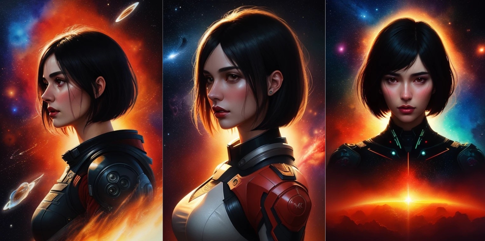 ilustración de la parte superior del cuerpo, 1chica, pelo negro, corte bob, traje espacial futurista, (arte digital), tinta de acuarela, (calidad ultra:1.3), obra maestra, (muy detallado), HDR, 8K, arte abstracto, (por Charlie Bowater:0.9), (estilo de Maciej Kuciara), ciencia ficción, estrellas fractales, espacio, increíble fondo espacial, tema rojo, tema negro, medios mixtos