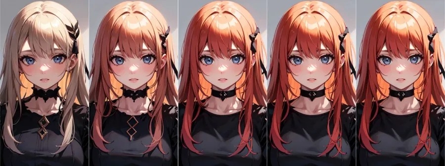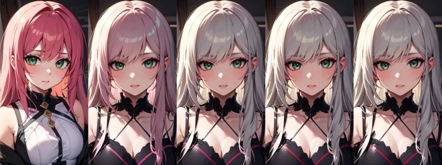 Como puedes ver, no hay pelo rosado en la tercera y las ultimas imagenes porque la IA ya ha generado la composicion principal y no puede realizar cambios incluso si añadimos pelo rosa