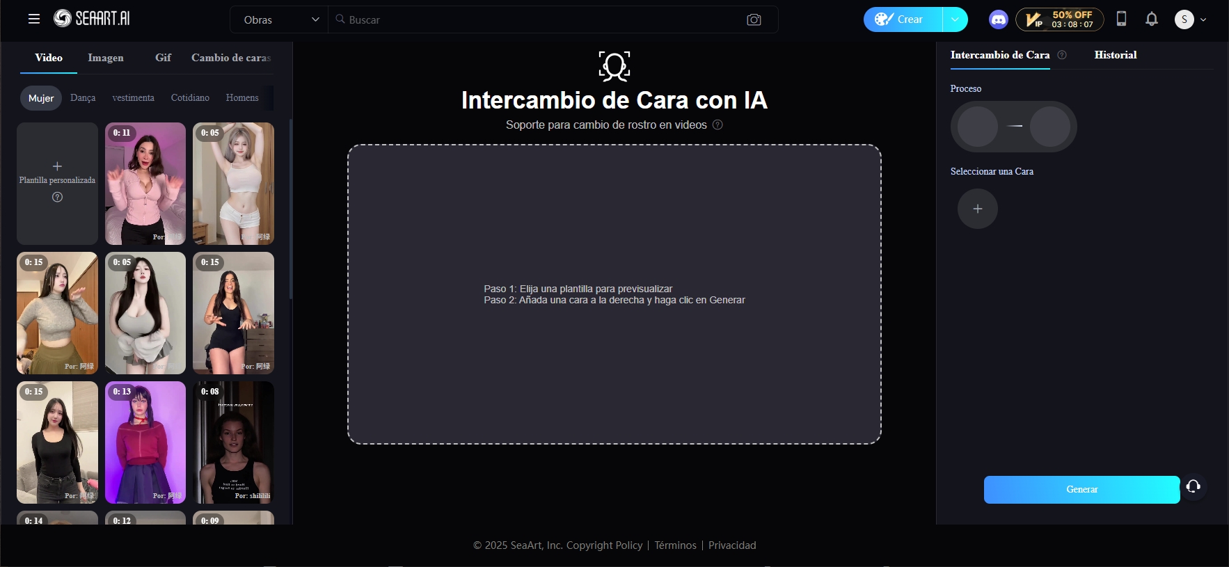 Puedes cargar tus plantillas favoritas (o utilizar las que te proporciona SeaArt) y utilizar la función Intercambio de caras de SeaArt.AI para cambiar la cara de la persona influyente virtual antes de publicarla en las redes sociales.