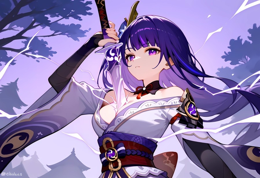 score_9, score_8_up, score_7_up, score_6_up, score_5_up, score_4_up, source_anime, (anime), (vista frontal), enfoque en solitario, 1chica, raiden shogun, [rostro desdeñoso|rostro atormentado], lunar debajo del ojo, sosteniendo, sosteniendo arma, sosteniendo espada, (espada entre los pechos), (vaina humana:1.2), electricidad, musou isshin (genshin impact), bosque de sakura, (cielo púrpura:1.2), [[relámpago]], pose estética, lista para luchar