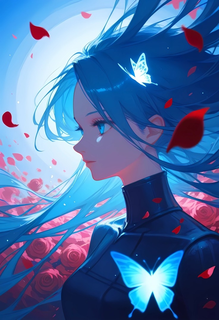 score_9, score_8_up, score_7_up, score_6_up, score_5_up, score_4_up, source_anime, enfoque en solitario, apto para todo público, ((retrato de una chica)), torso, arte abstracto, surrealista, tocando una mariposa, cabello flotante, mariposa azul, paisaje brillante, (pétalos cayendo, pétalos de rosa:1.2), tema azul, tema carmesí, (tema aguamarina:1.2), (contraste oscuro:1.3), claroscuro de color, (abismo, campos misteriosos:1.3), fondo increíble, dispersión subsuperficial, arte etéreo y caprichoso