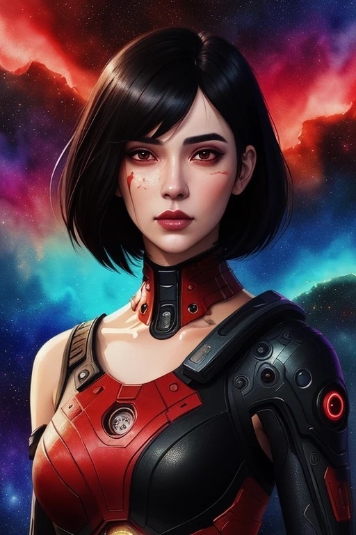 ilustração de meio corpo, 1 garota, cabelo preto, corte bob, traje espacial futurista, (arte digital), tinta aquarela, (qualidade ultra:1.3), obra-prima, (altamente detalhado), HDR, 8K, arte abstrata, (por Charlie Bowater:0.9), (estilo de Maciej Kuciara), ficção científica, estrelas fractais, espaço, fundo espacial incrível, tema vermelho, tema preto, técnica mista