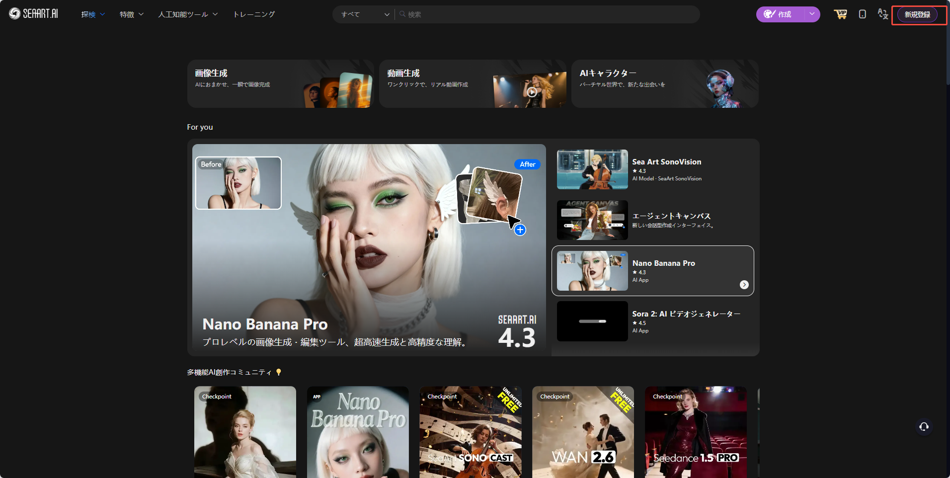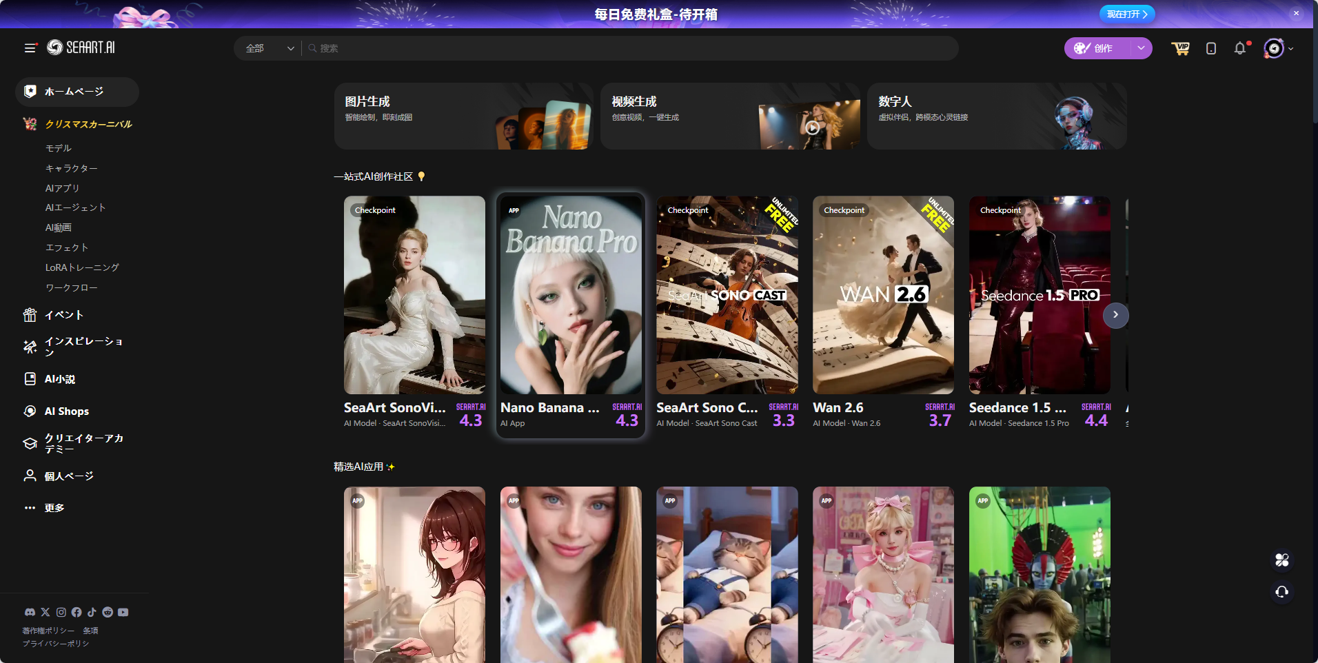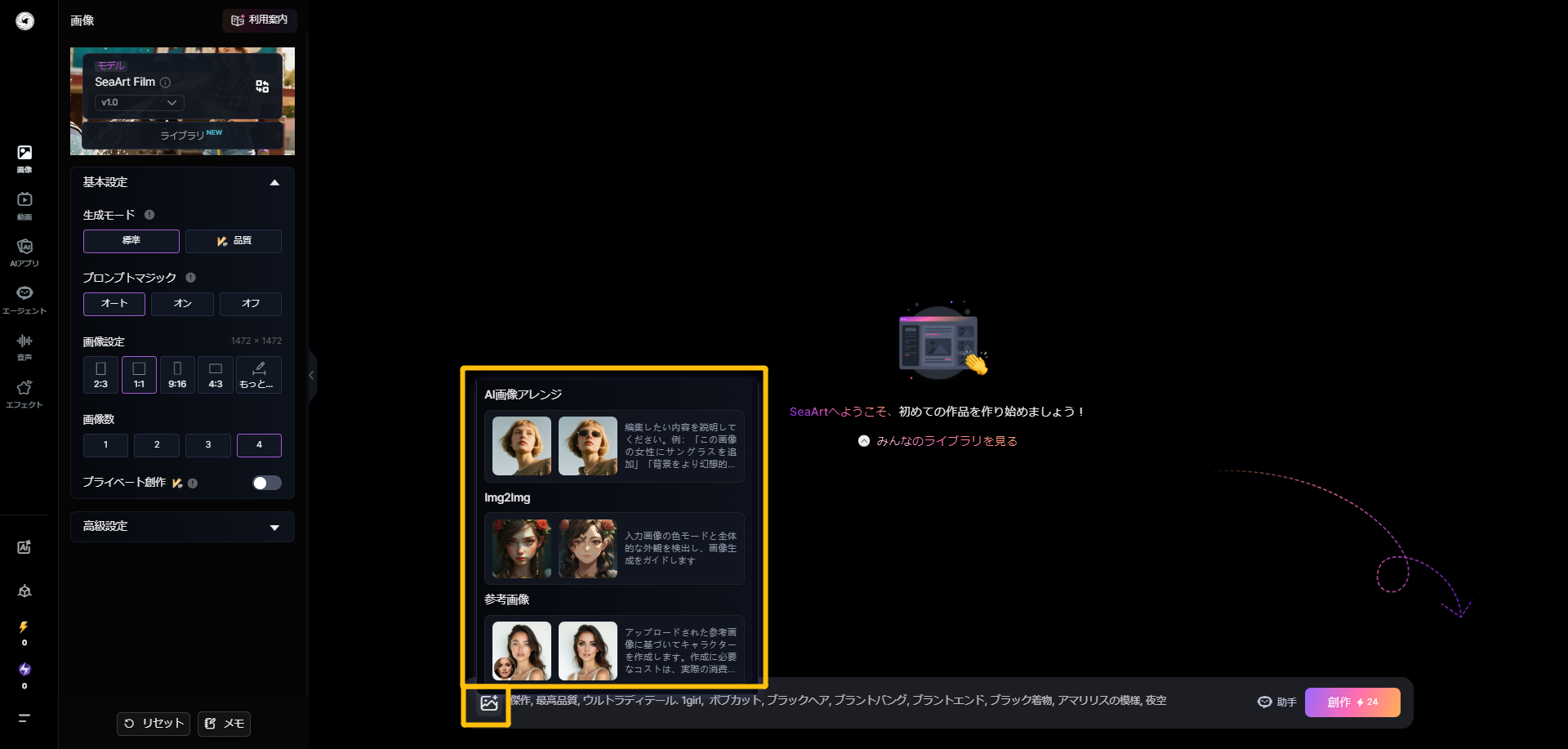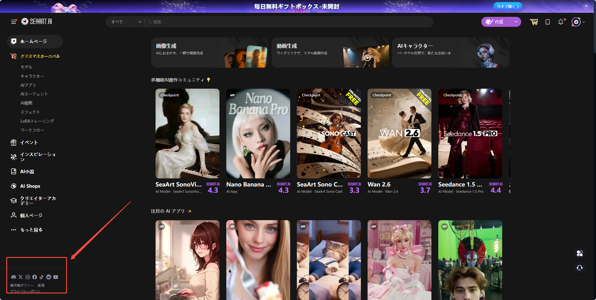 **アクセス方法：**&#x5DE6;上の<mark style="background-color:yellow;">「</mark>[ホームページ](https://www.seaart.ai/ja)<mark style="background-color:yellow;">」</mark>をクリックしてください。