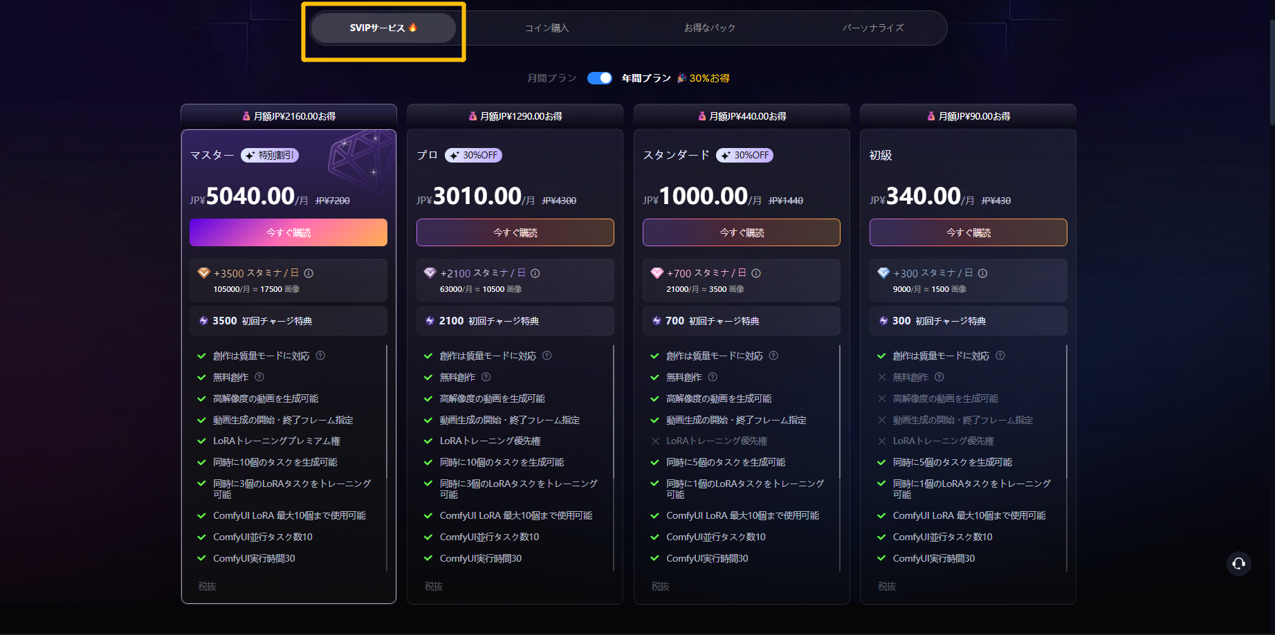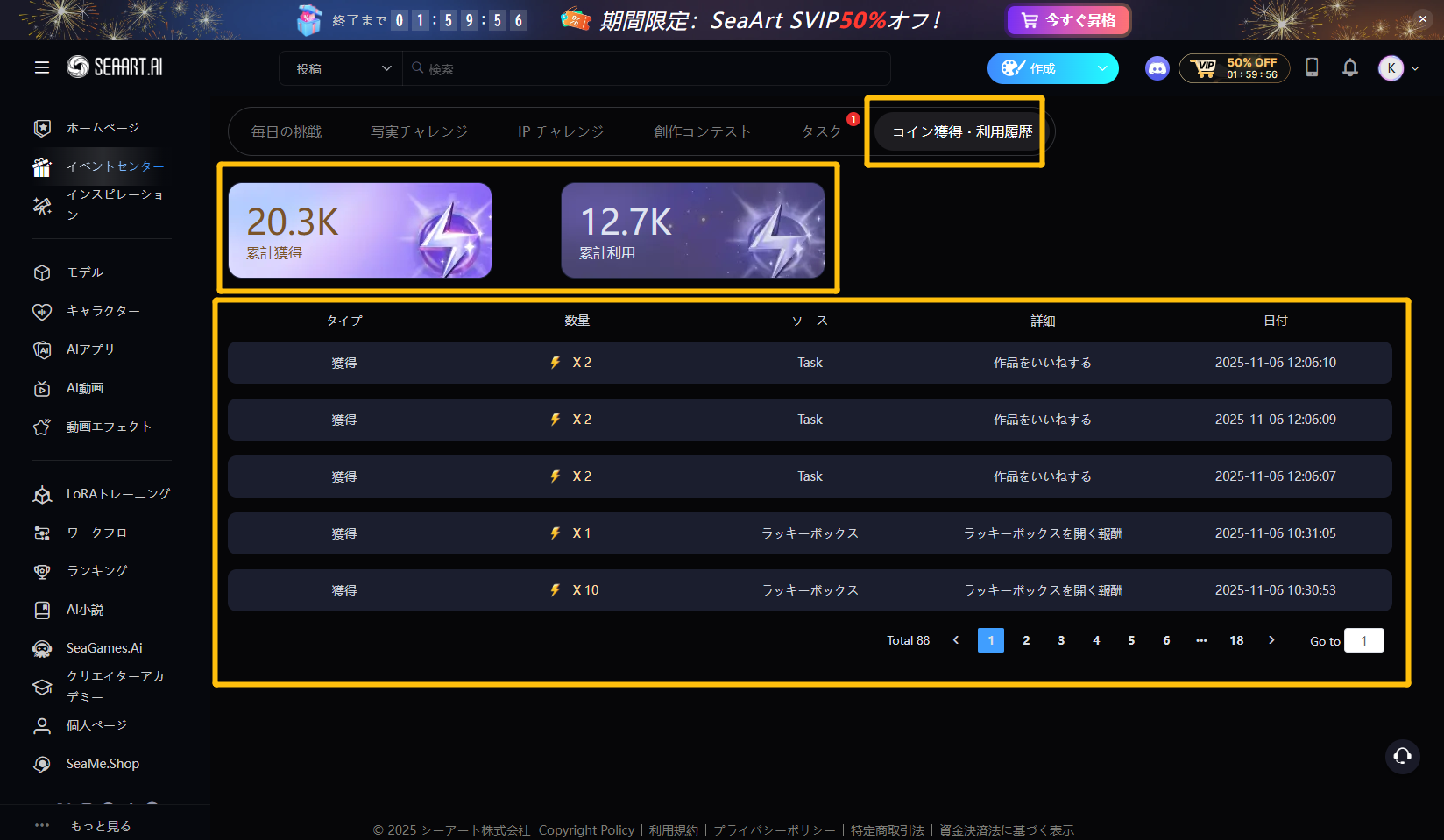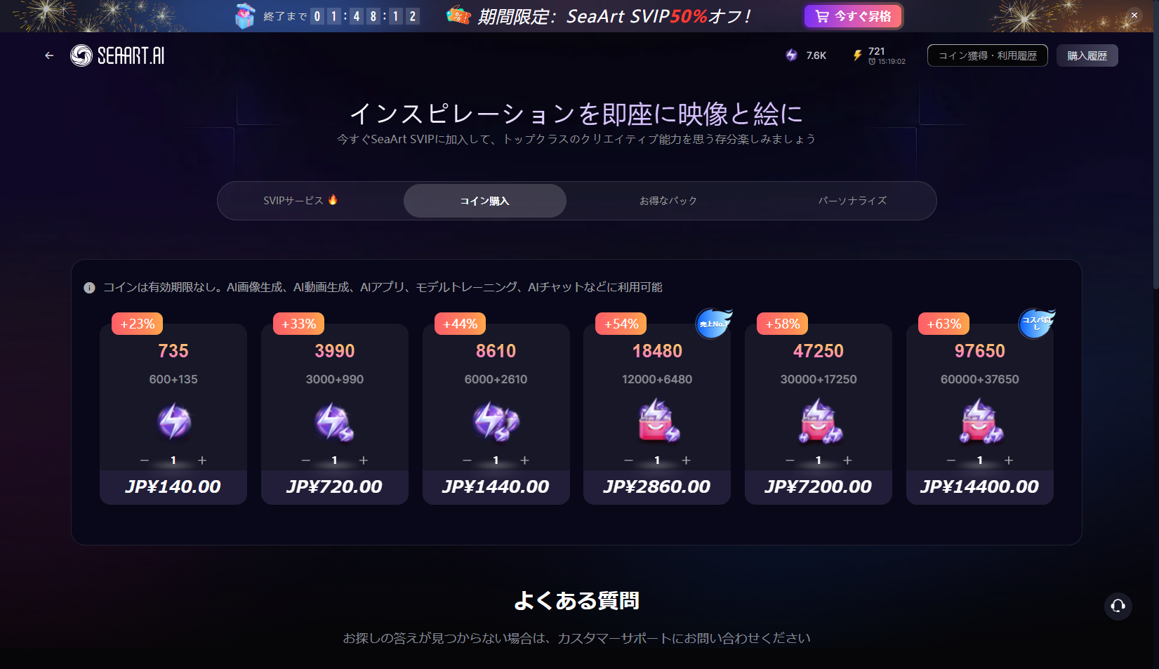 ページ右上の「VIP」アイコンをクリックすると、SeaArtショップで価格を確認してコインを購入できます。