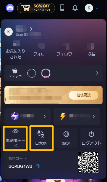 左下に、ユーザーIDと個人招待コードが表示されます。