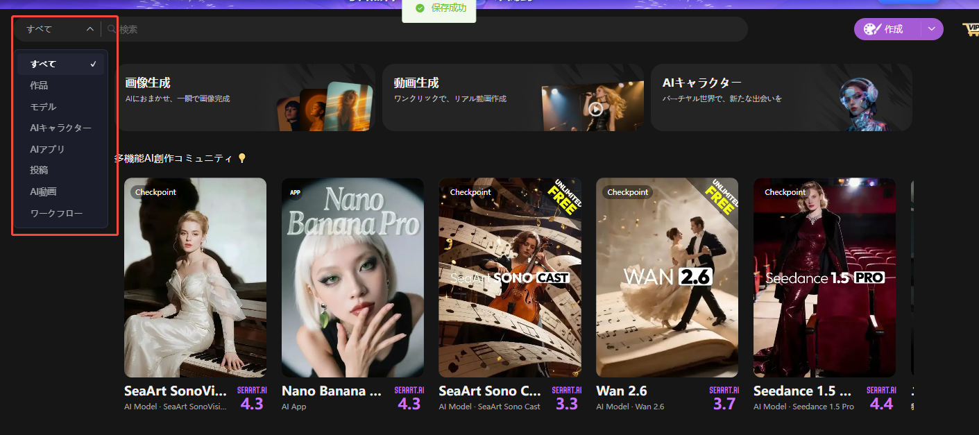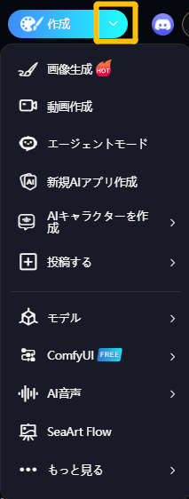 > アクセス方法：右上の「作成」ボタンの横にある「ｖ」アイコンにマウスを合わせると、画像生成、動画生成、AIキャラクター、音声、ワークフローなどの機能が表示されます。お好みの機能を選択してお試しください。