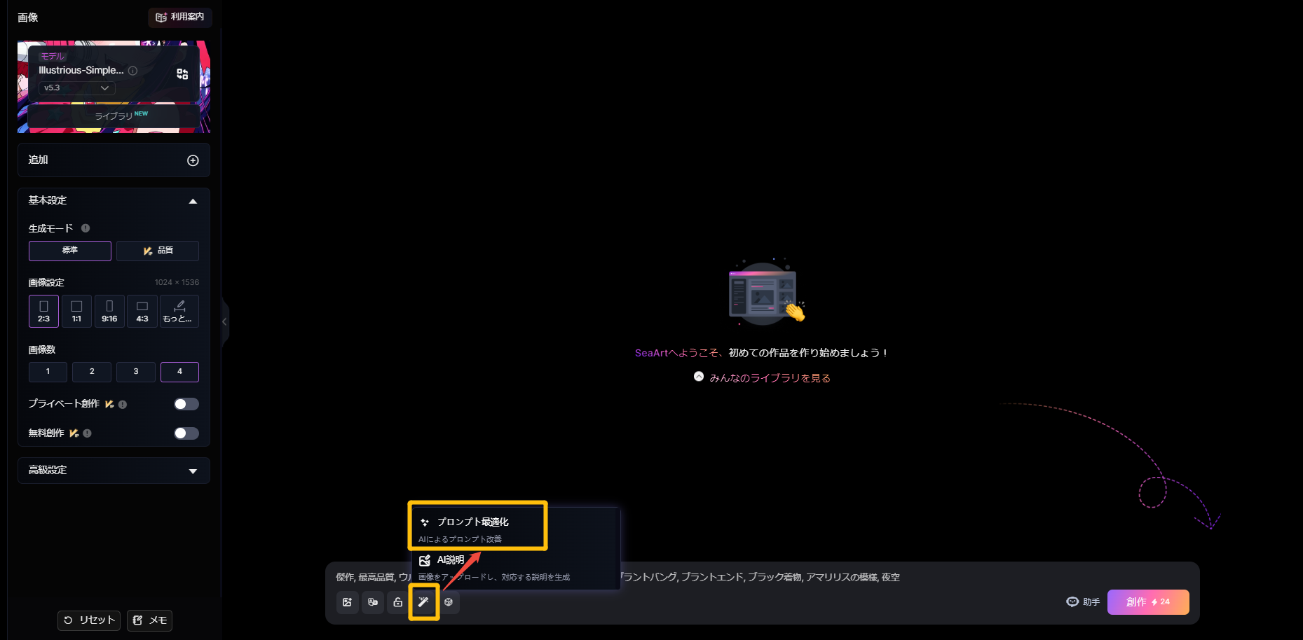 * **プロンプト最適化：**&#x4F5C;成欄にプロンプトを入力してこの機能をクリックすると、AIが自動的に内容を最適化してくれます。