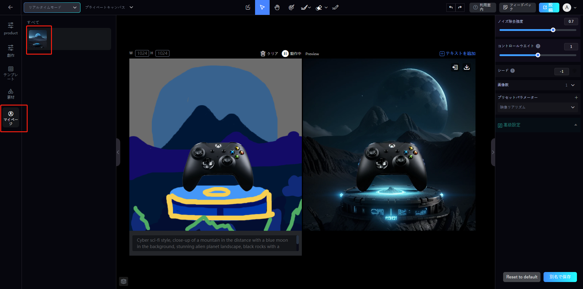 「創作モード」で、選択した画像を右クリックし「マイページに保存」を選択します。