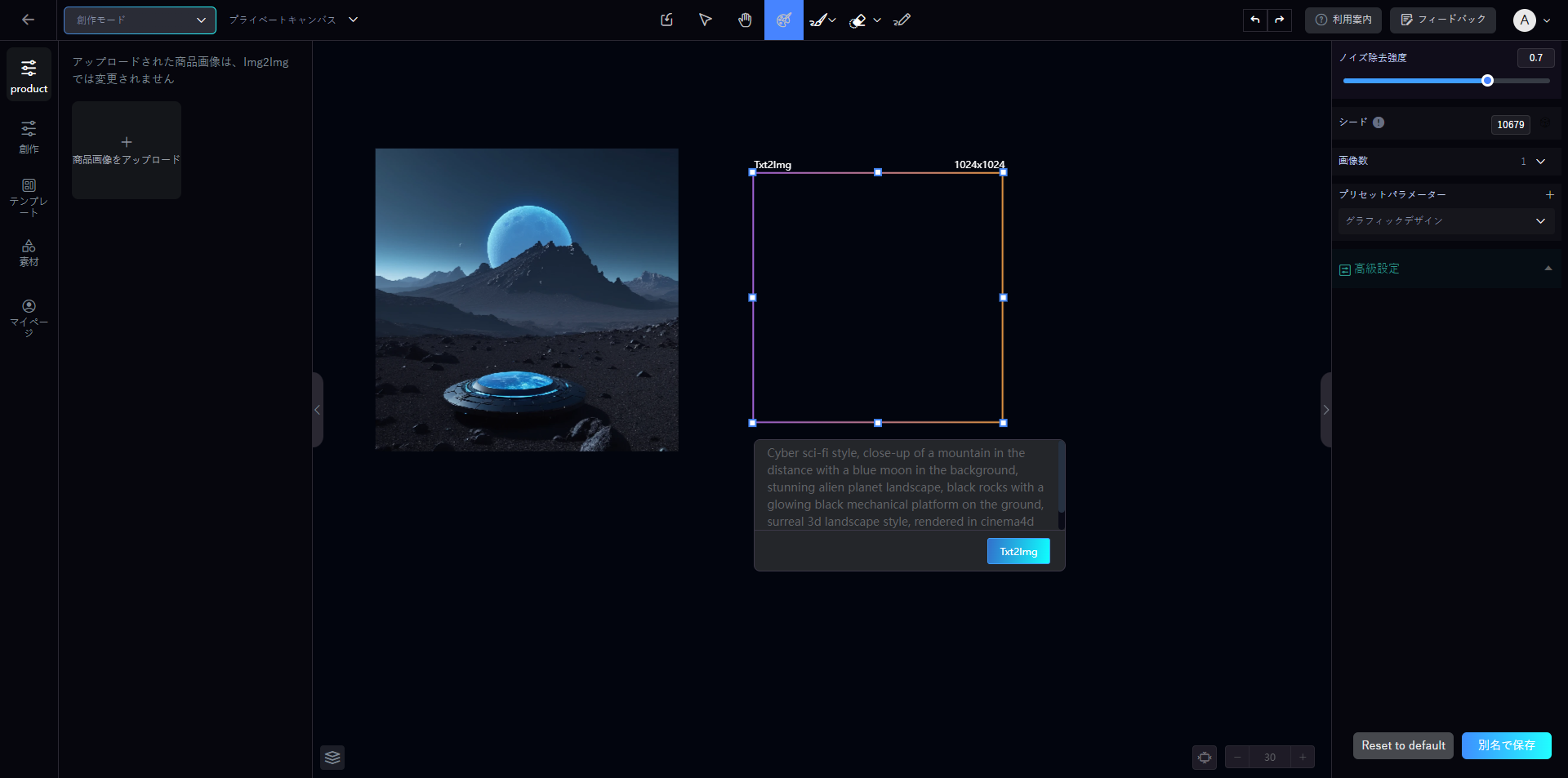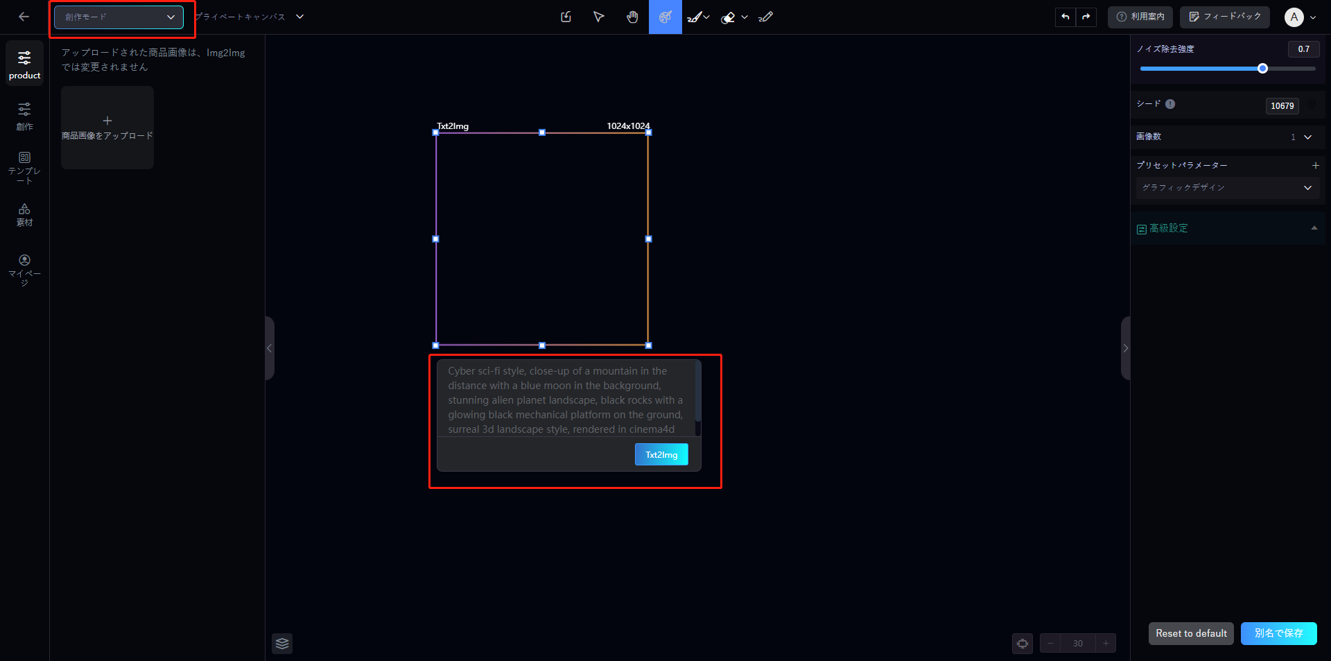 左側&#x306E;**「product」**&#x30AA;プションをクリックし、**「商品画像をアップロード」**&#x6A5F;能を選択します。製品画像をアップロードすると、システムは自動的にクリッピング操作を行い、描画プロセス中に製品画像がクリアで正確であることを保証します。